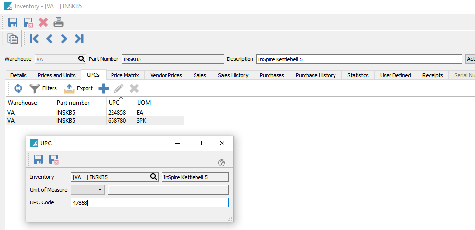 This new feature allows for any number of UPC codes to be added to each unit of measure. The user can then scan any of the barcodes into Spire and the correct item and unit of measure will be applied.