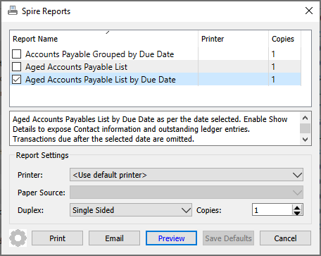 Accounts Payable Grouped by Due Date – Prints a list of outstanding vendor transactions, grouped by due date and sorted with oldest transactions at the top. Overdue transactions display the due date in red font.