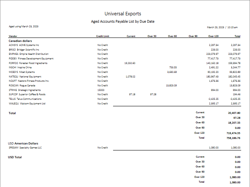 Aged Accounts Payable List – Prints a list of vendors and their respective open transaction totals in columns aged by transaction date, grouped by currency. Transactions with a date after today are excluded from the report.