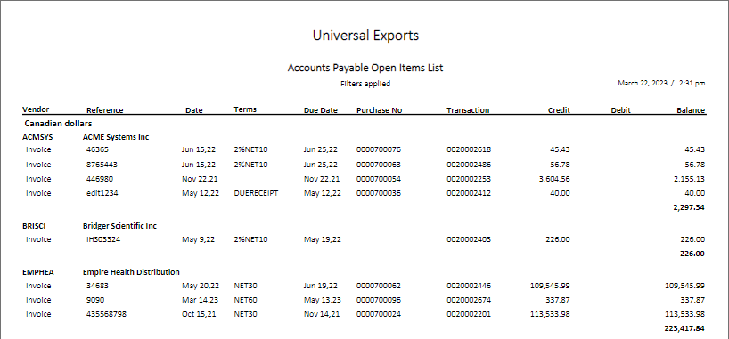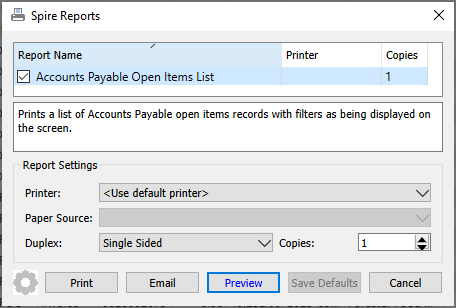 Accounts Payable Open Items List – Prints a list of vendors and their respective open transactions. A Filter can be applied to restrict transactions to a group of vendors or a specified date range or other criteria.