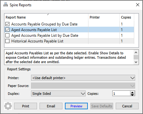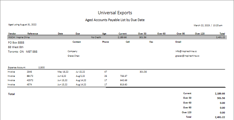 Aged Accounts Payable List – Prints a list of vendors and their respective transaction totals in columns aged by transaction date, grouped by currency, calculated from open and historical transactions as of the report date. Transactions with a date after the aging date are excluded from the report. If Details are shown, contact info and individual transactions are also printed.