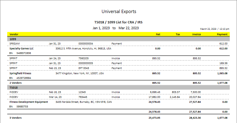 CPRS-T5018 IRS-1099 List – Prints a list of vendors that have either 1099 or T5018 as a Report Type, and transactions within the report date range. Invoice and Payment totals in Base currency and the billing address print for each vendor, grouped by 1099 or T5018. If Details are shown, individual transactions are also printed.