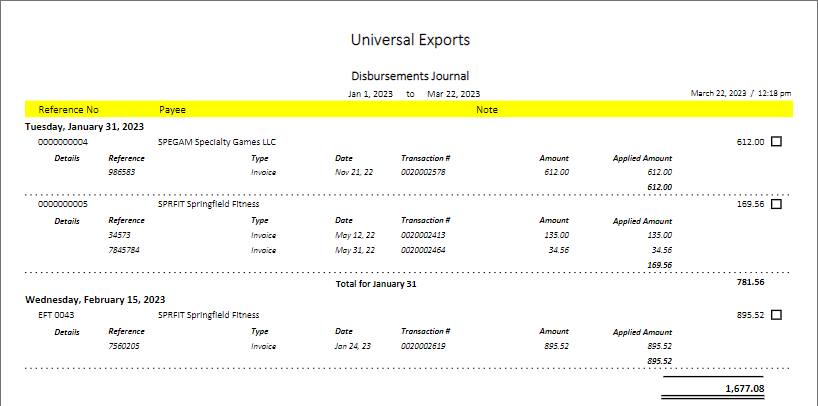 Disbursements Journal – Prints a list of payments within the selected date range, sorted by date, and for the specified vendor if one was chosen. If Details are shown, paid invoices are also printed with each payment.