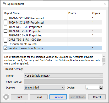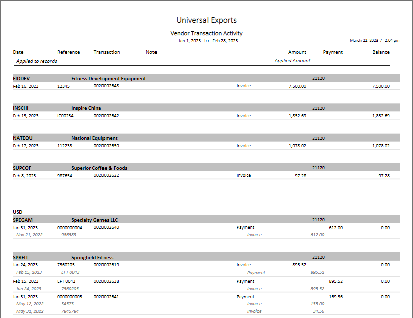 Vendor Transaction Activity – Prints a list of transactions within the selected date range, grouped by vendor and currency. If Details are shown, applied transactions are also printed.