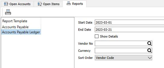 Show Details – Enable this option to print Contact information and a list of open transactions and their respective amounts for each vendor. Disable this option to print a single line for each vendor and total amounts.