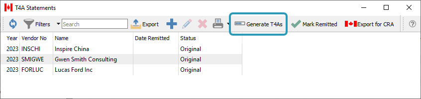 To create a T4A for all vendors that had purchases in that year, use the Generate T4A toolbar button.