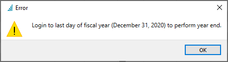 To be able to perform the year end, the user must be logged into Spire with the last day of the “Last Year” fiscal calendar. If they use a different date they will see this message.