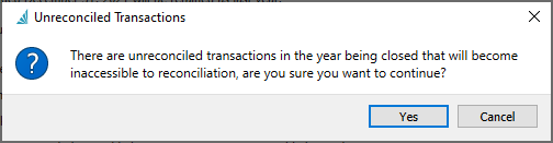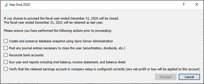 The ‘Proceed’ button will be grayed out unless the user checks all warning messages. When you are able to Proceed from this screen, Spire still checks for unreconciled transactions in all bank accounts and if any are found, a warning message appears to indicate this.