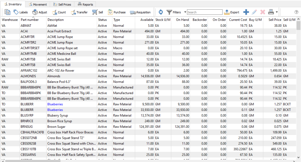 When the Inventory module is opened, the list of items is presented in a grid with the column layout remembered from the previous use.