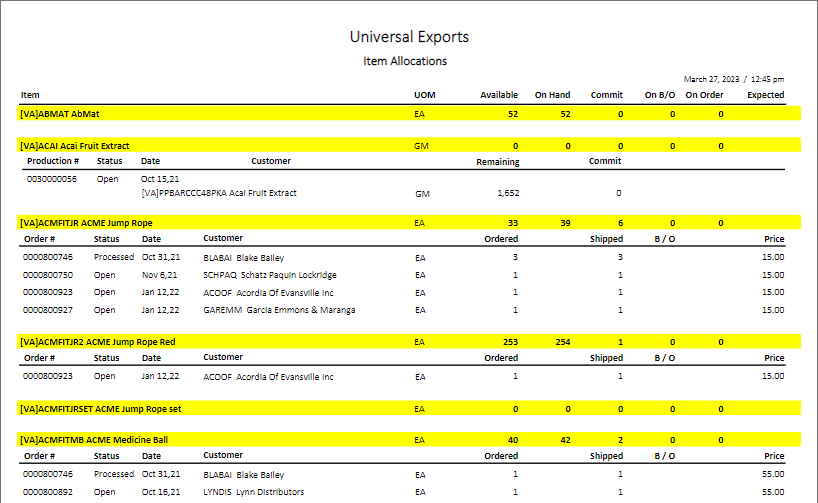 Item Allocations – Prints a list of selected items and quantity on hand and allocated information, any sales or production or purchase orders they exist on.