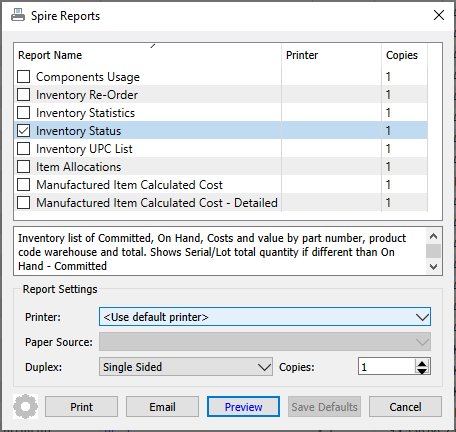 Print – Prints inventory reports, either or all or selected items in the grid.