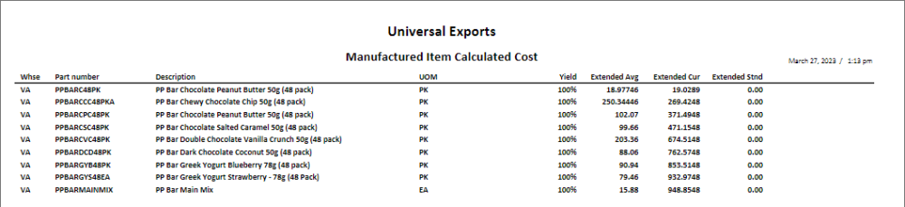 Manufactured Item Calculated Cost – Prints a list of selected manufactured items and their respective calculated costs from the components on the Bill of Materials tab of each item. The Bill of Materials Extended Cost prints as the Extended Average on this report, and the Extended Current and Standard costs are calculated from component usage and respective costs.