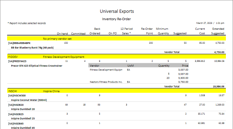 Inventory Re-Order – Prints a list of selected items that also have a non-zero suggested order quantity, grouped by primary vendor. Quantity on Hand and other allocated quantities are also printed for each item, with the current unit cost and the calculated cost to purchase the suggested quantity. Any Vendor prices configured for items are also printed. If an item has a zero suggested order quantity, it will be excluded from the report.