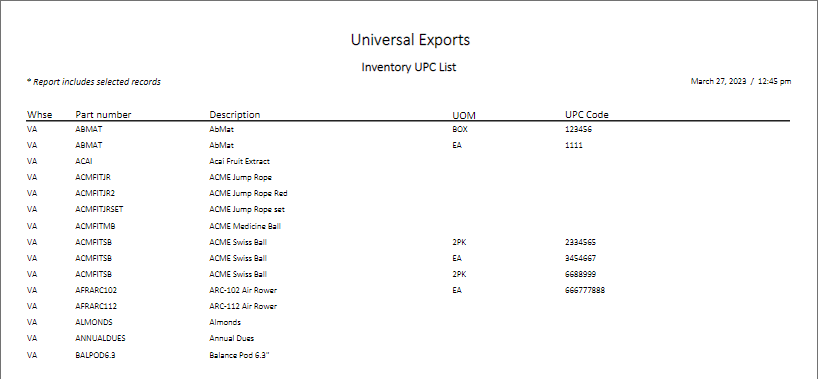 Inventory UPC List – Prints a list of selected items and any UPC code values for each item. If multiple UPC codes exist for an item, either with the same or different unit of measure, they are listed separately.