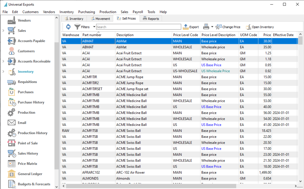 This screen is useful to create a filtered list of price levels across a group or all inventory items, for the purpose of exporting to a spreadsheet and re-importing price changes.