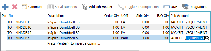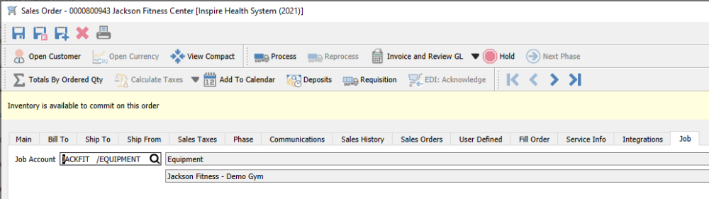 To select a job for a sales order, you can select the job and account from the Job tab. When selected, each line of the order will be populated with the selected job and account.