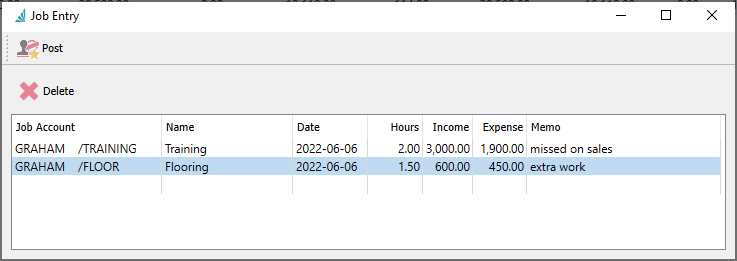 Job Entry – Create an ad-hoc transaction for a selected Job and sub-account, assigning a date, hours, income and expense amounts not linked to some other purchase or sales transaction.