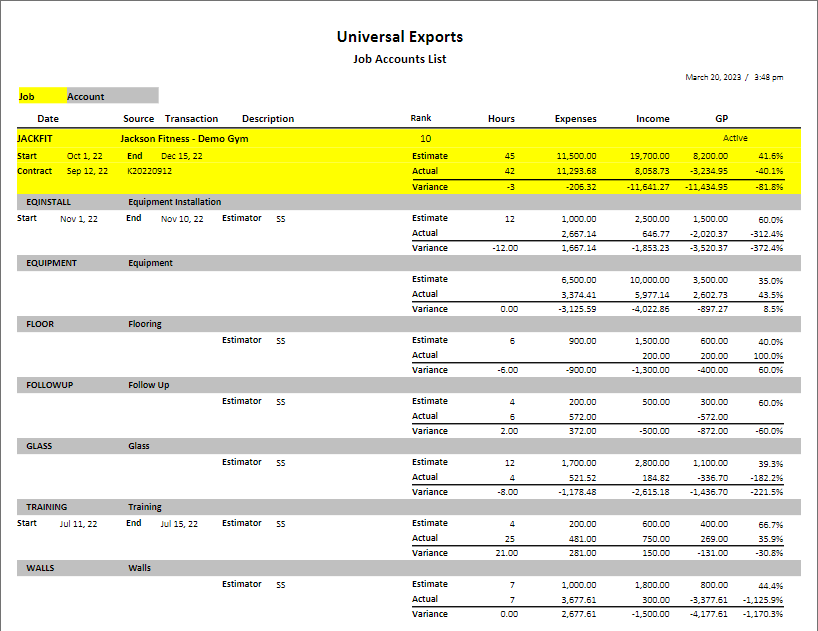 A grid is displayed showing the job account totals for all transactions posted to this job account, what was originally estimated, and the variance between these amounts. This is useful to track how much of this job account has been completed, how close to the original estimate did the job transactions compare, and how profitable this job portion was.