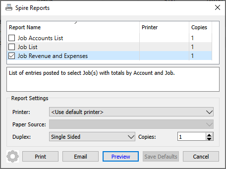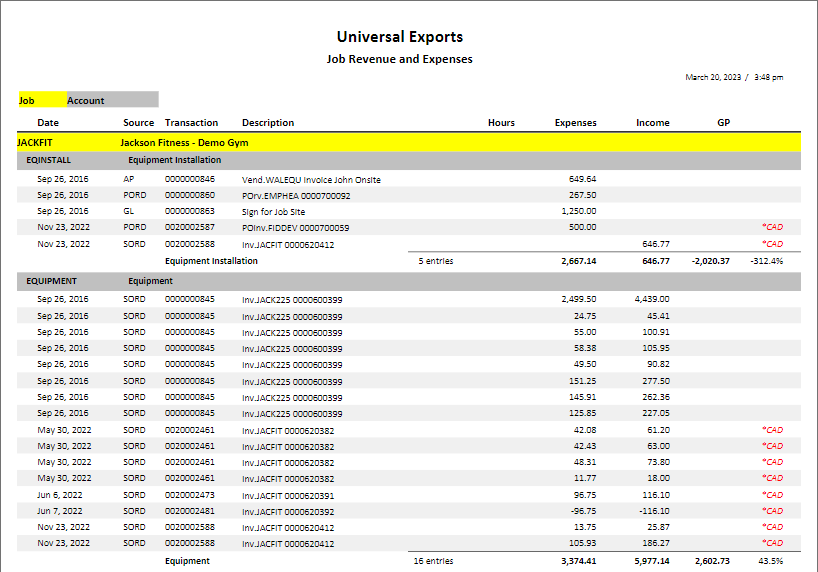Job Revenue and Expenses – Prints a list of transactions for each job and account, with expense and income amounts and totals.