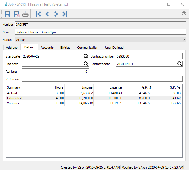 The Details tab allows storing overall information about the job and a summary of transactions to date.