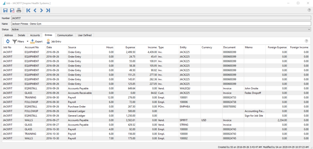 The Entries tab displays all transactions that have been posted with a reference to this job and any account. Here is where you can see the detailed breakdown of the Actual hours, expenses and income for each job account. You can also export the grid contents to an Excel or CSV file, or create a new ad-hoc Job Entry for this job to record any income or expenses that didn’t go through another module.