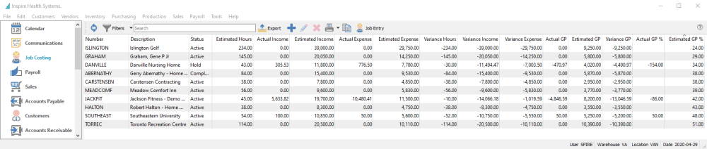 This screen shows a list of all customer jobs, their respective statuses and accumulated revenue and expenses. It has all the standard toolbar buttons available to create or edit jobs, filter or search for jobs, and export the list to an Excel or CSV file.