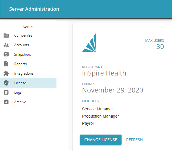 Refresh – Click refresh if new modules or user licenses have been purchased. This will happen automatically every 4 hours.