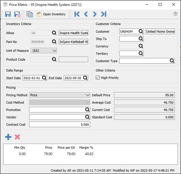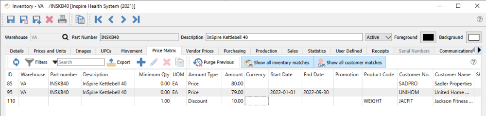 Show all inventory matches – Toggle on to show all records regardless of the inventory criteria, and toggle off to display only price matrix records specifically assigned to this item or product code.