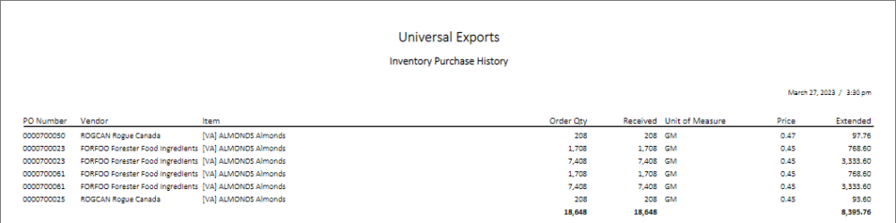 For selected or all records for this item, you can print the Inventory Purchase History report, with quantities ordered, received and costs.