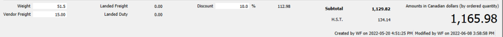Weight – The total weight of the items on the purchase order. It is calculated from the extended weight of all items on the PO, but you can override this value if required.