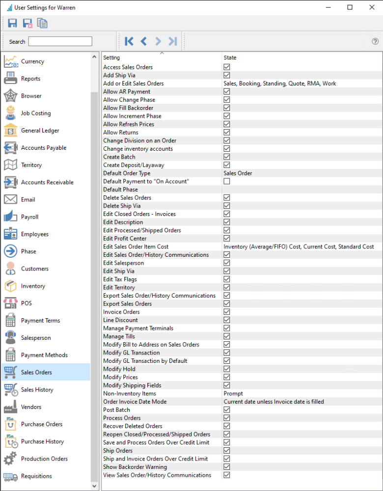 Invoice Orders – Allows the user to create an invoice for an order. If disabled, the Invoice toolbar button is inactive. An additional user setting controls what happens if the customer has an outstanding balance greater than their Limited Credit.