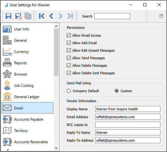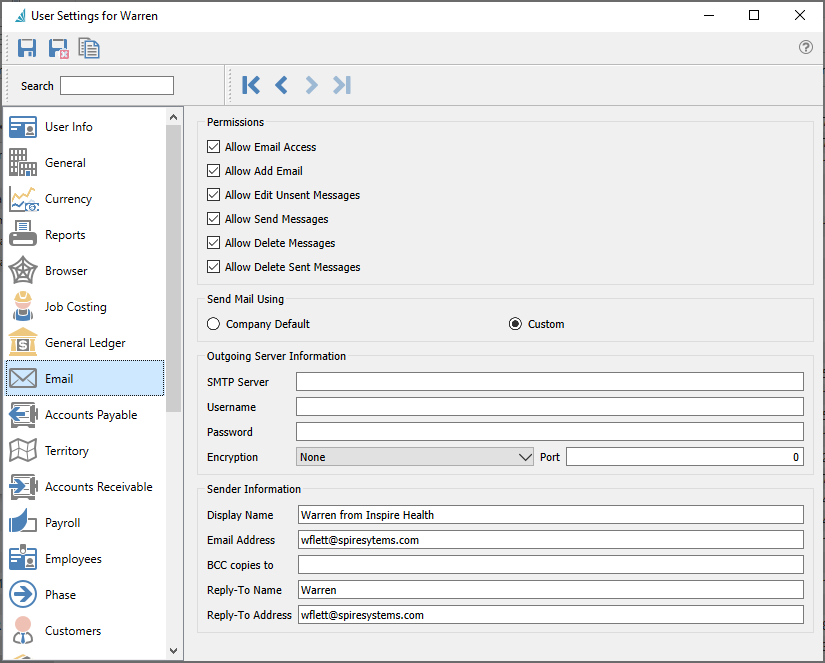In this section you will set permissions for the Email module, and the name and email address for both outgoing mail and where recipients can reply to. If left as default, the email settings will come from the email configuration in Company Settings.