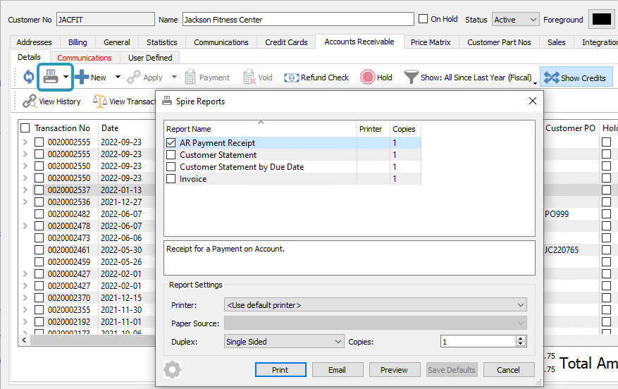 - Re-print AR Payment Receipt report from within Accounts Receivable details list
