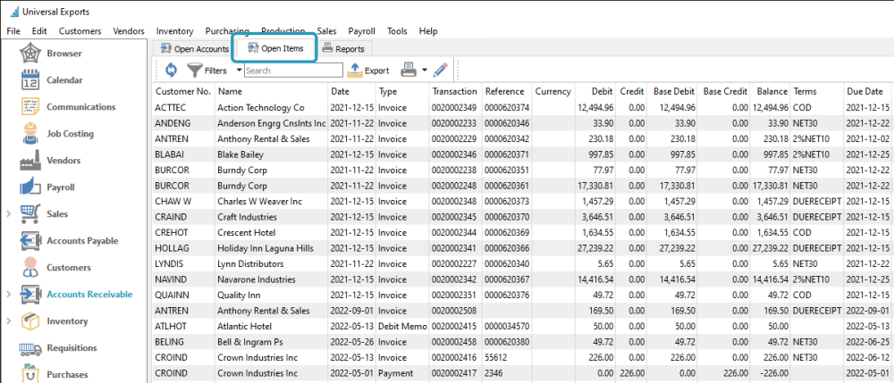 - Accounts Receivable and Accounts Payable have a new Open Items tab, listing all outstanding transactions.