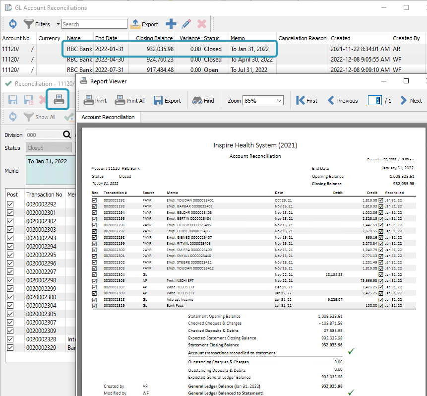- Reprint previous bank reconciliation reports.