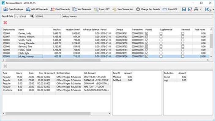 Here’s a screenshot of how information will appear after data is entered or imported. You’ll notice that data is visible even after posting the timecard.