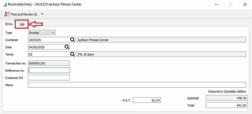 After creating an Accounts Receivables invoice, including the transaction Reference value and the amount, you can access the Job tab to enter the job and account values. This is sometimes used to add extra fees that are not posted through a sales order/invoice.