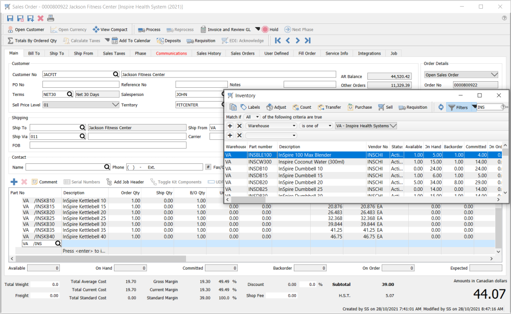 Any text previously entered will be used in the item search box, to restrict the list to items that match based on code, description, notes, product codes, vendors and much more. This means you can type information other than the item code into this field in order to locate the item. Filters may also be used to restrict item display. And this inventory window also editing or adding items on the fly if you have the user security settings to do so. If you edit an item on lookup, you can see everything about that item, including who has it on another sales order or what purchase orders the item is coming in on and when, even before this item is added to the order.