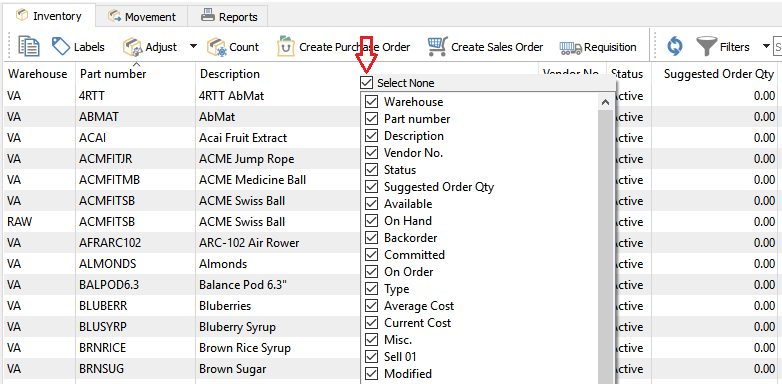 Columns can be moved to any position by dragging a single column from the original to the new location, and they can be added or removed as required, by right-clicking on the grid title row to bring up the available field list. Fields may be individually enabled for display, or the “Select All” or “Select None” checkbox may be used to select or remove all fields.