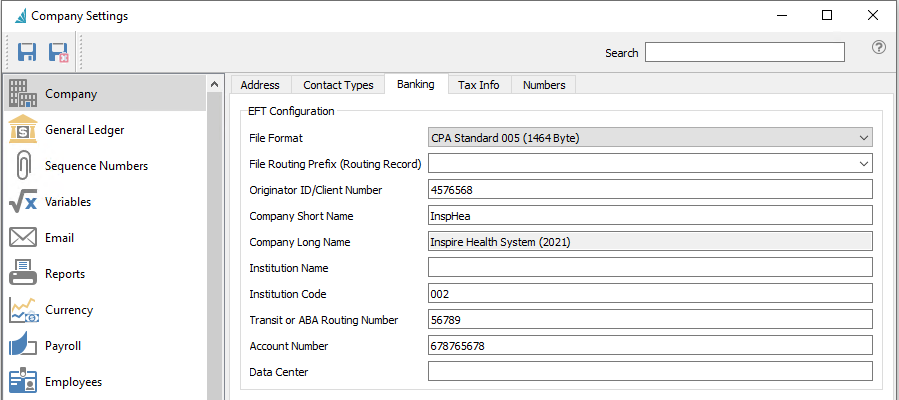 The Billing tab is where you enter your banking information to be used with payroll direct deposit and accounts payable EFT. The selections are CPA Standard 005(1464), TD 80 Byte, NACH ACH (94 Byte), and CIBC (1464 Byte).