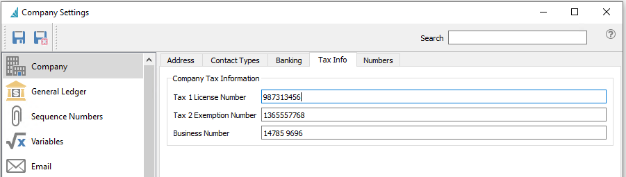 For the Company information, there are 5 separate tabs with settings general to the company.