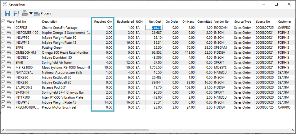 You can select one or more orders from the grid to requisition. To assist in locating orders with backordered quantity, you can create and assign a filter to the grid that only displays orders that have the Backordered status with a True value. When all desired orders are highlighted, click the Requisition button to load all items into the Requisition work screen, with Required Quantities equal to the respective sales order Backordered quantities, ignoring any other quantity values from the inventory item.