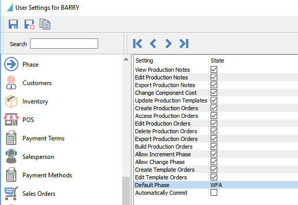Allow Increment Phases – Allows the user to update the phase field to the next phase in sequence by clicking the Next Phase button, either from the Production Order list or when editing a production order. Disabling this option does not prevent the user from changing the phase directly, as that is controlled with a different user setting.