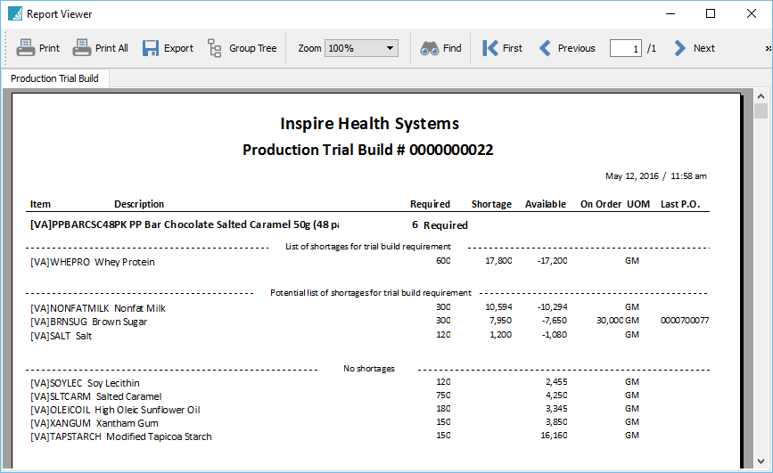 To get a printed version of shortages, click on the print icon and select “Production Trial Build” report.