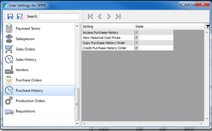 Access Purchase History – Allows the user to open the Purchase History module. In addition, records on the Purchasing / History tab when editing a vendor will be hidden from display.