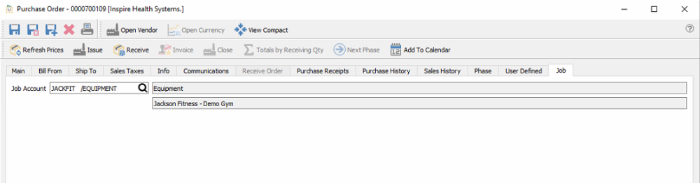 One way to select a job and account for a purchase order is to open the Job tab and do so here. After the selection, each detail line of the PO will be populated with the selected job and account.