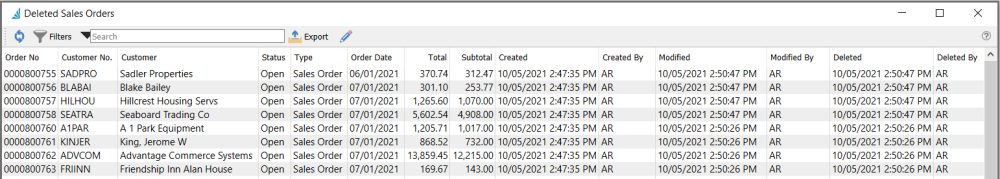 A list of deleted orders will be displayed. Locate the one that needs to be recovered, and Filters and the Search box can assist in this, and double-click or use the Edit button to open it.