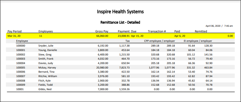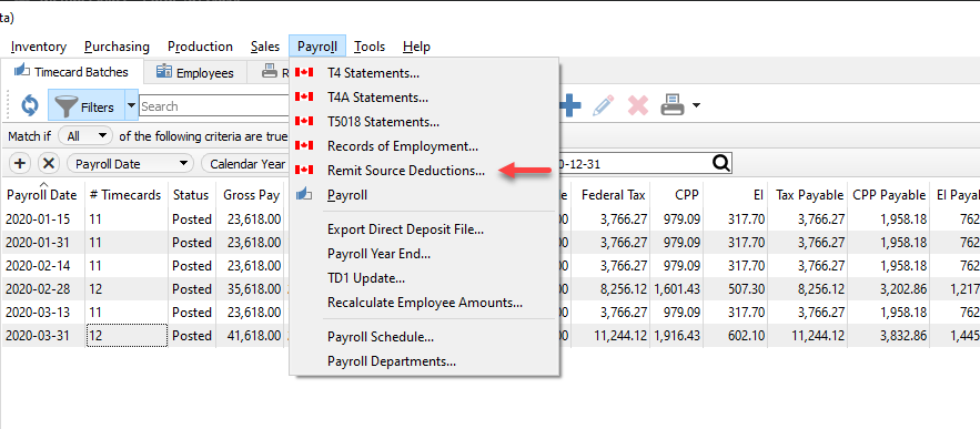 Once all timecards are posted for the reporting period, go to the top menu Payroll -> Payroll Remit Source Deductions